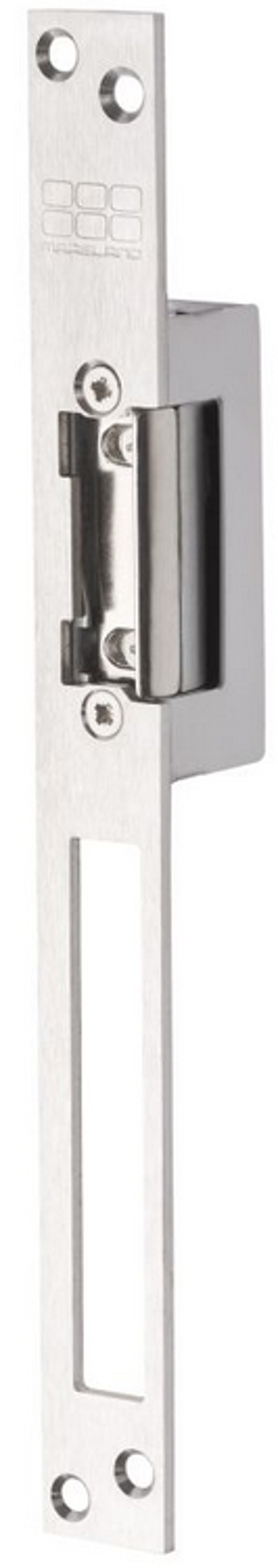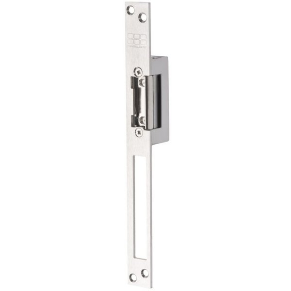 Elektrische deuropener - sluitplaat - deurvergrendeling - lange sluitplaat - dag en nachtschoot - arbeid of ruststroom - links/rechts - inbouw - max 980 mA - rvs - diode - houdkracht 330 kg - voeding 10V tot 24V AC of DC