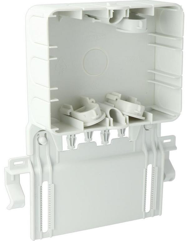 Kabeldoos data onderbak - consolidation box - afneembare montageplaat - grijs - kunststof - wand/plafond/kabelgoot - halogeenvrij - IP20 - afmeting 120x95x40mm (lxbxd) - 10 uitbreekpoorten - 2 dataschuif 1 blindschuif - temperatuur -40+70°C - UTP Cat6/6A - spanning tot 690V - geschikt voor AK2-D deksel/RJ45-adapters - past op kabelgoot Legrand (Van Geel) , Stago, Niedax, Vergokan, PUK en OBO