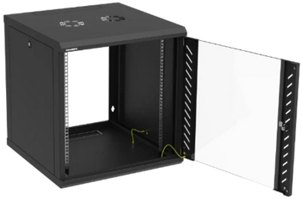 Patchkast - wandkast - 19-inch - staal - zwart (RAL9005) - sleutelslot - aardingskit - veiligheidsglas - panelen uitneembaar - kabelinvoer boven of onder - natuurlijke ventilatie - afmetingen: breed 60 cm / diep 50 cm / hoog 63,5 cm (12U of 12HE) - IP20