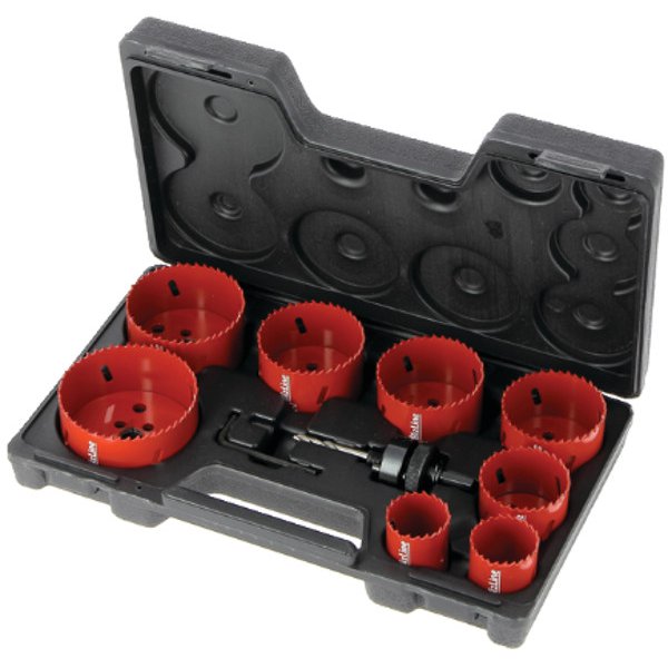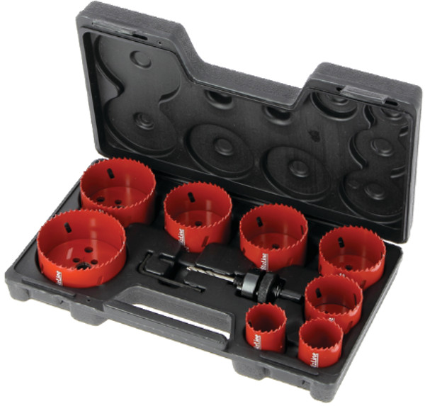Gatzagenset - koffer - compleet - 8-stuks - gatmaat: Ø 38, 40, 54, 64, 67, 68, 76 en 86 mm - bi-metaal: hss / kobalt - inclusief houder - boordiepte 38 mm - hollewanddoos - sparingen - gaten - buisleidingen - kabels - rood - hout - metaal - staal - plastic - pleisterplaat - gips