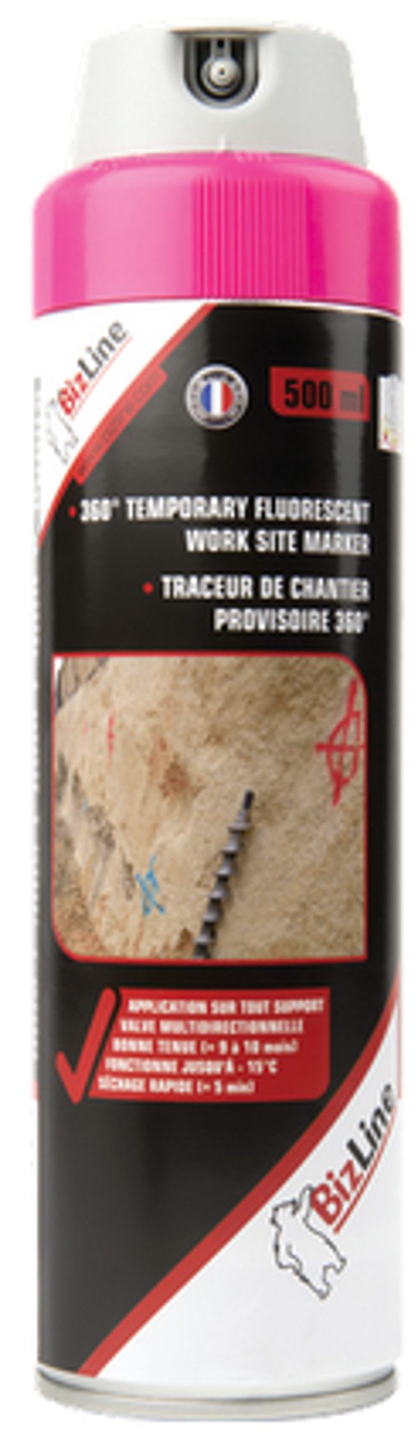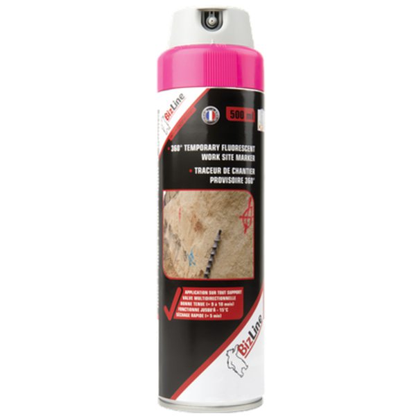 Goed zichtbare fluorescerende markering spuitbus om markeringen opvallend en duurzaam te maken. Uitstekende optimale flexibiliteit bij het markeren. Hechting op alle oppervlakken, zelfs vochtige ondergrond. Tijdelijke markering gedurende 12 maanden, afhankelijk van de ondergrond, toepassingsomstandigheden en UV-blootstelling. Uitstekend geschikt voor gebruik aan het plafond. Snel droog in 10 minuten. Markering in alle richtingen dankzij het 360° draaibare ventiel. Milieuvriendelijkere formule met meer dan 25% water. Houd het uit de buurt van warmtebronnen en zonlicht.