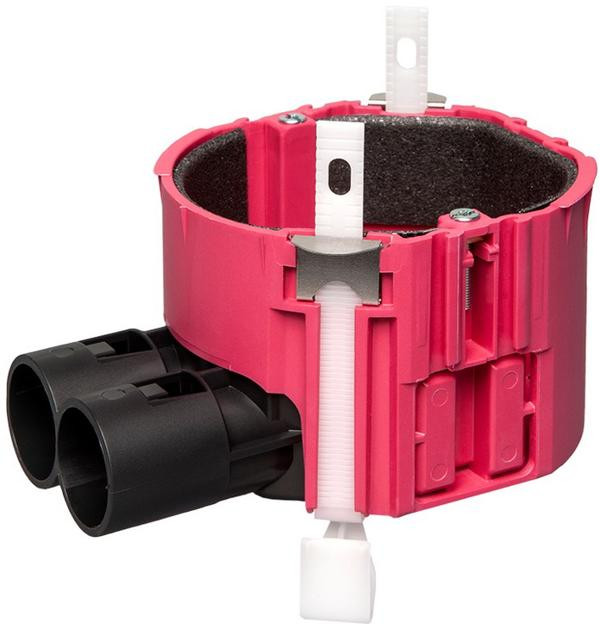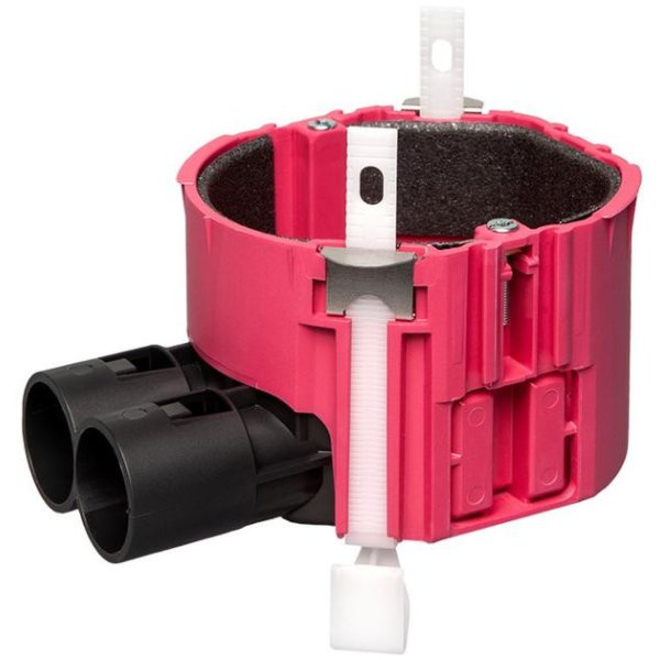Hollewanddoos - inbouwdoos - verbindingsdoos - brandwerend - 60 minuten functiebehoud E60 - metalstud gips- of houtplaat 7 - 27 mm - kunststof - koppelbaar - rood - wand/plafond - doosboor 76 mm - diep 50 mm - 2x tuit 16/19/20mm - buisvergrendeling - halogeenvrij - 2 schroefjes schakelmateriaal - snel bevestigen