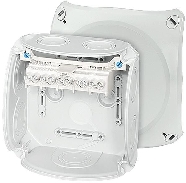 Kabeldoos met blinddeksel - PP - grijs (RAL7035) - wand/plafond - binnen/buiten - 5-polig klemblok 1,5 - 6 mm2 - halogeenvrij - stofdicht - spatwaterdicht - IP66 - afmeting 130x130x77 mm (lxbxd) - 7 elastische invoerpoorten wartel M25x1.5 mm en/of M32x1.5 mm - kabeldikte 9 t/m 21 mm - gewicht 0,24 kg - temperatuur -25+40 °C - spanning tot 690V