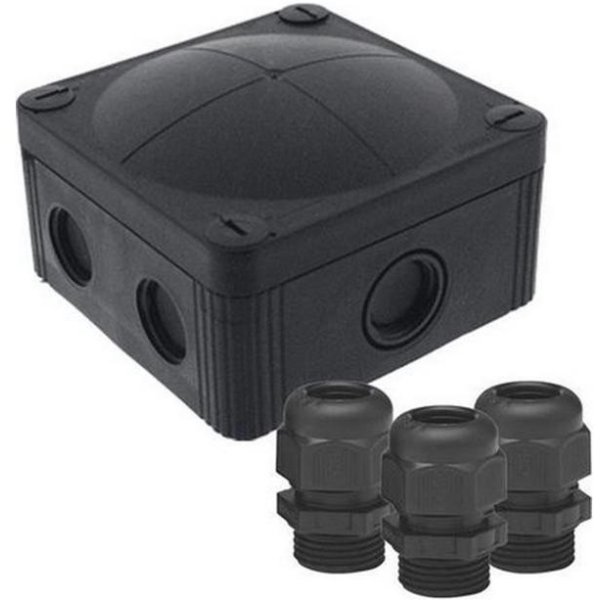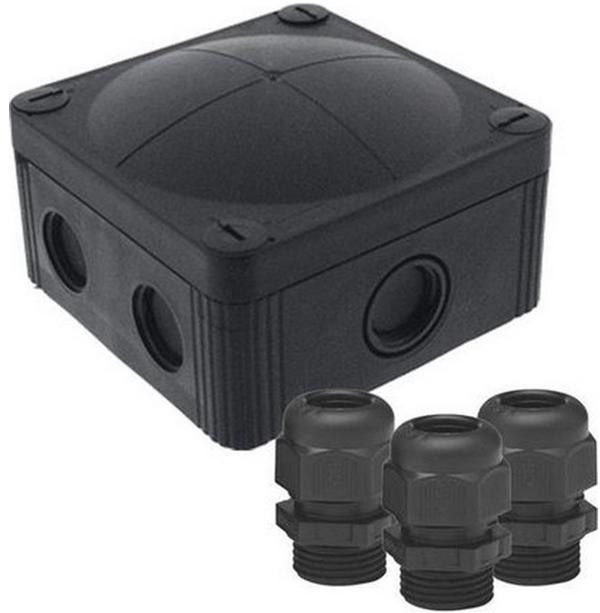 Kabeldoos inclusief 3 wartels M20x1.5 mm - PVC - zwart (RAL9005) - halogeenvrij - stofdicht - waterdicht - IP67 - afmeting 95x95x60 mm (lxhxd) - 7 invoerpoorten M20x1.5 mm en/of M25x1.5 mm - kabeldikte 3 t/m 12 mm - schroefdraad - temperatuur -30+100 °C - spanning tot 690V