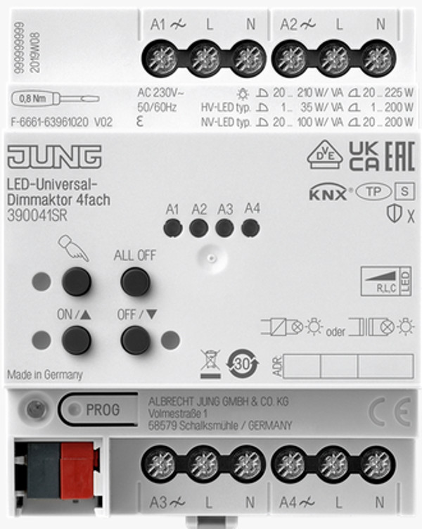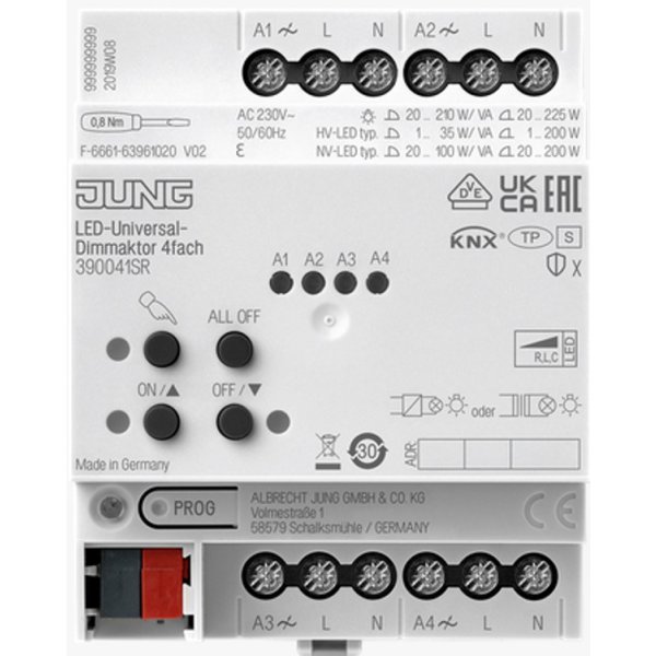 KNX dimactor 4-voudig - universeel - breed 4TE (72mm) - max 855W - ETS familie vanaf versie 5.7.3 - gloeilamp - HV halogeenlamp - LV halogeenlamp - ledlamp - spaarlamp - montage op DIN-rail (TS35) - spanning DC 21....32V SELV - stroomverbruik 15mA - aansluitklemmen 1x 0.5 ... 2,5 zonder adereindhuls 4mm