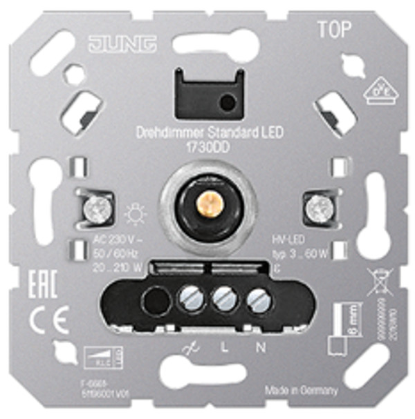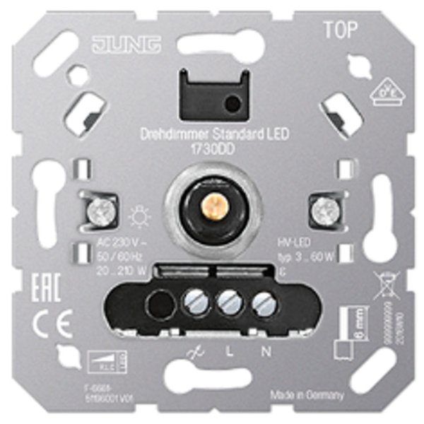 Draaidimmer type 1730DD - AS500 serie - LED (60W) - gloeilamp (210W) - halogeenlamp (210W) - elektronische trafo (60W)- spaarlamp (60W) - afmeting 71x71x32 mm (lxbxd) - dim principe: faseaansnijding - draai-/drukknop - 230V - inbouw hollewanddoos - schroefklemmen soepel/massief 0.5 tot 4 mm2 - lichtwaarde geheugen - IP20