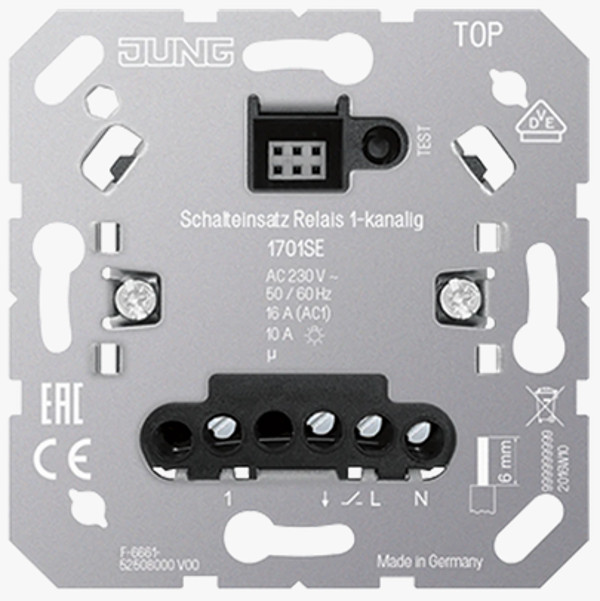Universeel relaiseenheid - 1-kanaal - aan/uit - tijdsvertraging - exclusief intelligent neventoestel/afdekking/schakelwip - 230VAC/50hz - schakelstroom motor 6A - verlichting LED (400W) - gloeilamp (2300W) - halogeenlamp (2300W) - elektronische trafo (1500W) - afmeting 71x71x24 mm (lxbxd) - inbouw hollewanddoos - schroefklemmen soepel/massief 1x0.5 tot 4 mm2 / 2x0.5 tot 2.5 mm2 - IP20
