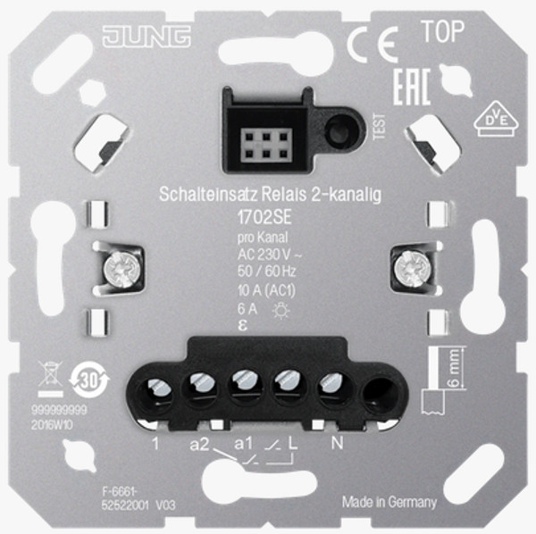 Universeel relaiseenheid - 2-kanalen - aan/uit - tijdvertraging - exclusief intelligent neventoestel/afdekking/schakelwip - 230VAC/50hz - schakelstroom 10A per kanaal - verlichting LED (400W) - gloeilamp (1500W) - halogeenlamp (1500W) - elektronische trafo (1000W) - afmeting 71x71x24 mm (lxbxd) - inbouw hollewanddoos - schroefklemmen soepel/massief 1x0.5 tot 4 mm2 / 2x0.5 tot 2.5mm2 - IP20