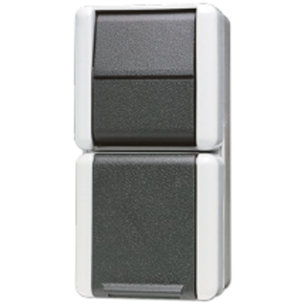 Wandcontactdoos met schakelaar type 876W - WG800 serie - verticaal - afmeting 151x75x58 mm (lxbxd) - klapdeksel - randaarde - wandcontactdoos 250V/16A - schakelaar 230V/10A - grijs (RAL7035) - thermoplast - UV bestendig - slagvast - halogeenvrij - opbouw - insteekklemmen massief tot 2,5 mm2 - IP44