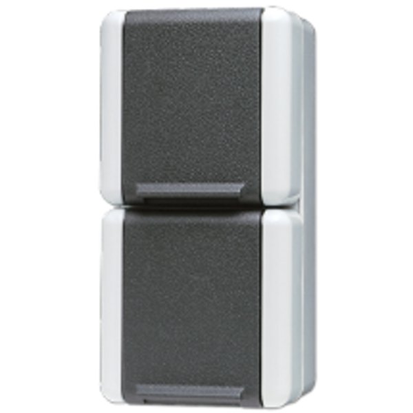 Wandcontactdoos type 822W - WG800 serie - verticaal - afmeting 75x151x58 mm (lxbxd) - klapdeksel - randaarde - 250V - 16A - grijs (RAL7035) - thermoplast - UV bestendig - slagvast - halogeenvrij - opbouw - insteekklemmen massief tot 2,5 mm2 - IP44