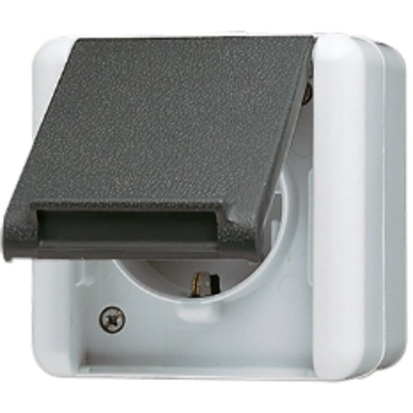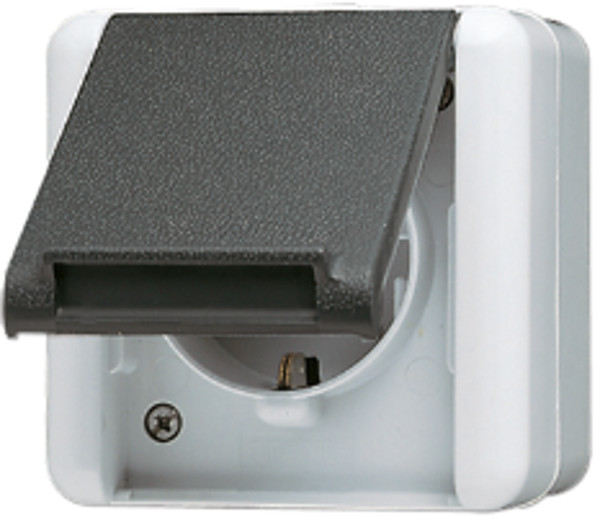 Wandcontactdoos type 820W - WG800 serie - afmeting 75x75x58 mm (lxbxd) - klapdeksel - randaarde - 250V - 16A - grijs (RAL7035) - thermoplast - UV bestendig - slagvast - halogeenvrij - opbouw - insteekklemmen massief tot 2,5 mm2 - IP44