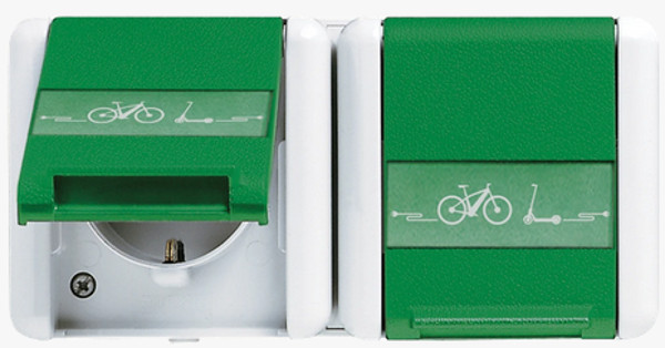 Elektrische fiets/scooter dubbele wandcontactdoos - fiets oplaadpunt - WG800 serie - afmeting 151x75x58 mm (lxbxd) - klapdeksel - randaarde - 250V - 16A - grijs (RAL7035) - thermoplast - uv bestendig - slagvast - halogeenvrij - opbouw - insteekklemmen massief tot 2,5 mm2 - IP44